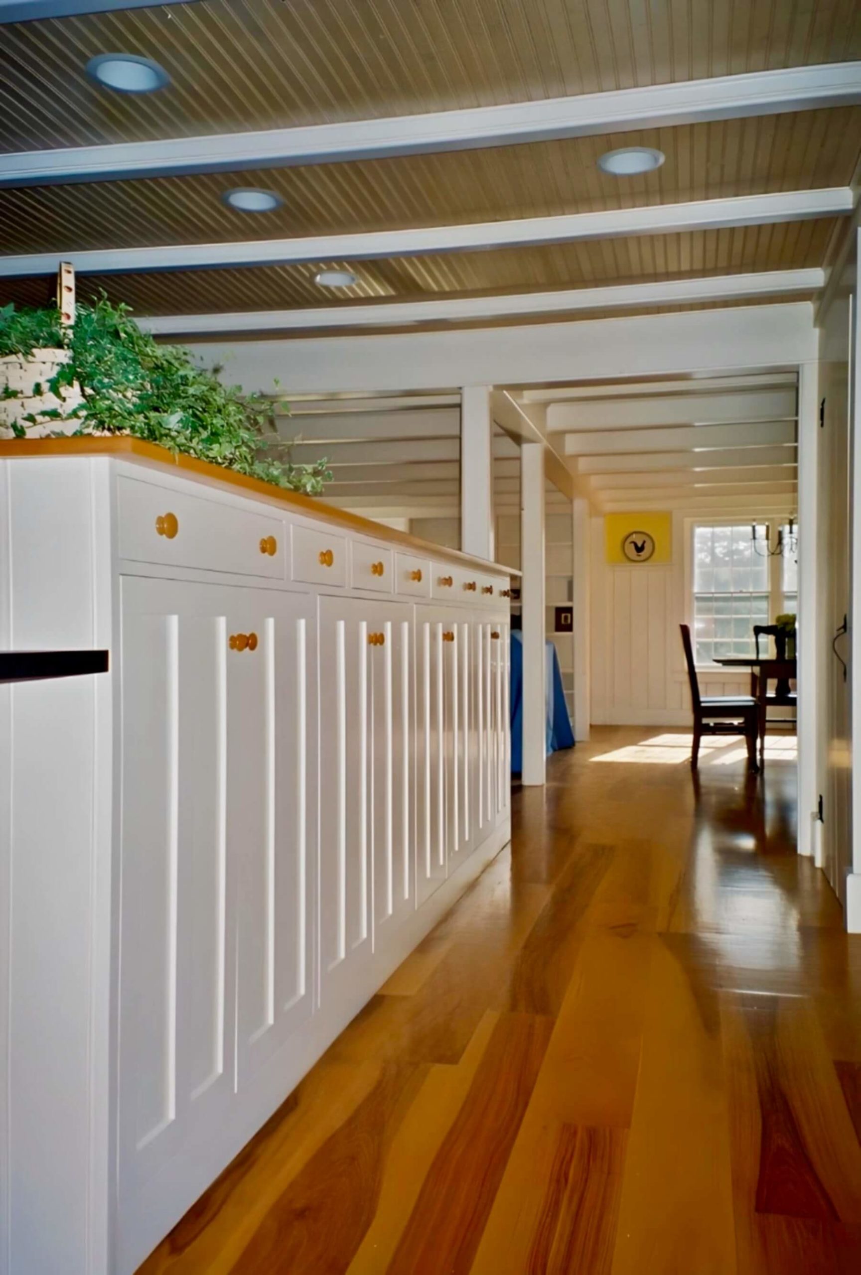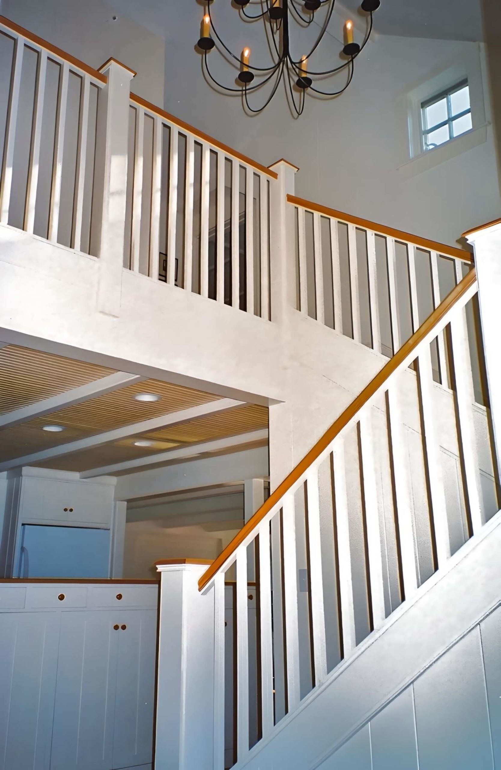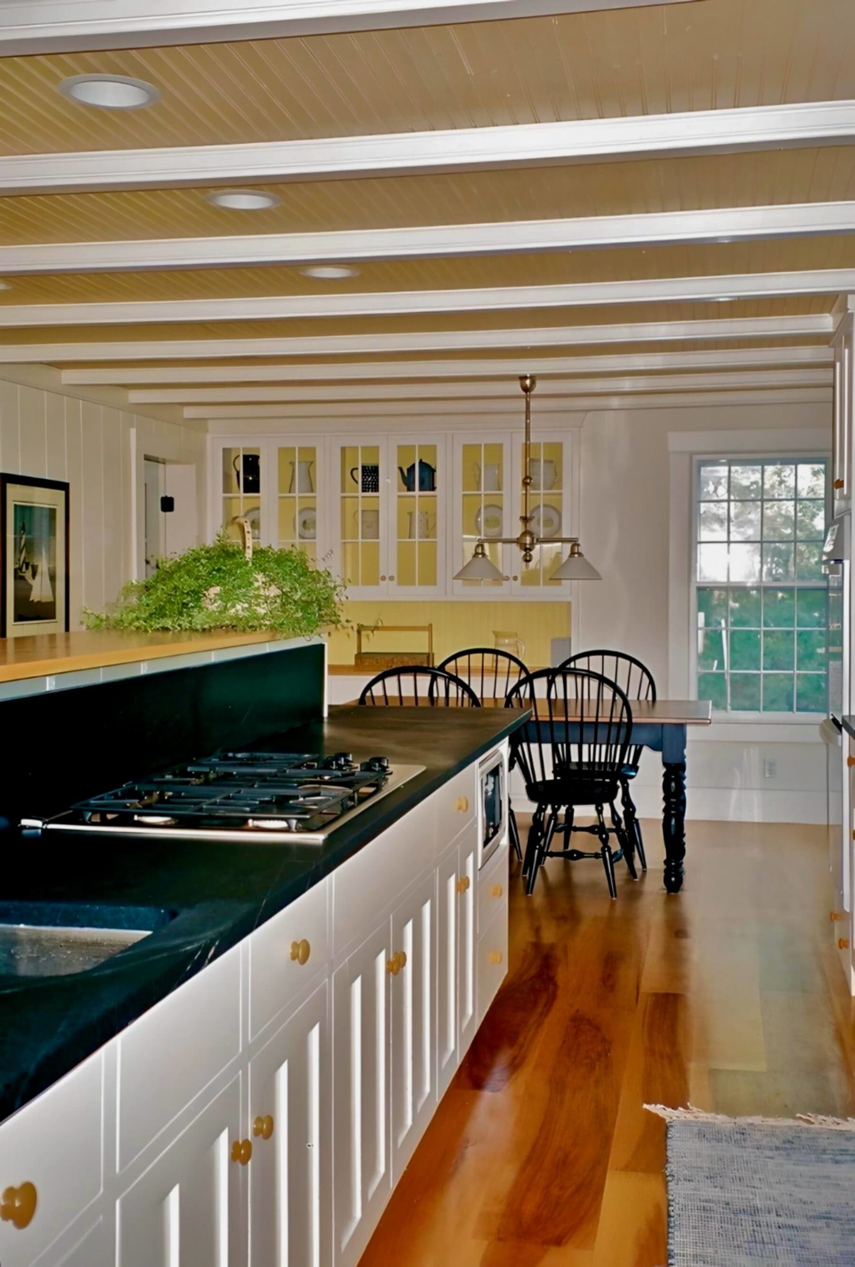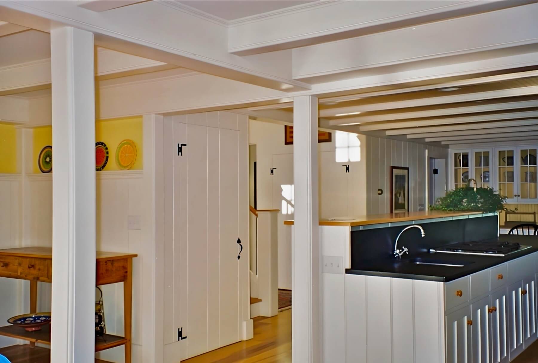 The main entry is from the small farmer’s porch into a surprisingly spacious vaulted stair hall lit by a doghouse dormer and three small windows running up along the stair. The living room, dining room and kitchen are all open to each other, but defined by columns, ceiling beams and the substantial kitchen island. Large windows and glass doors at the back of the house provide views of the water.
