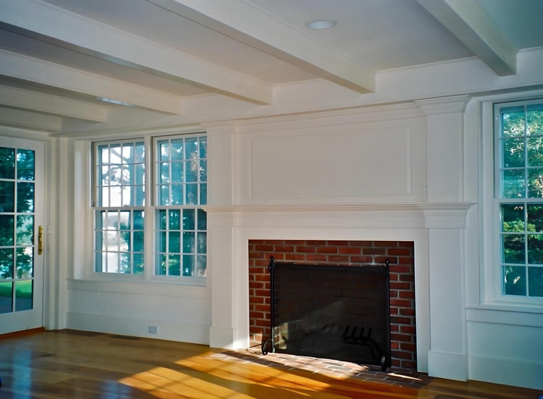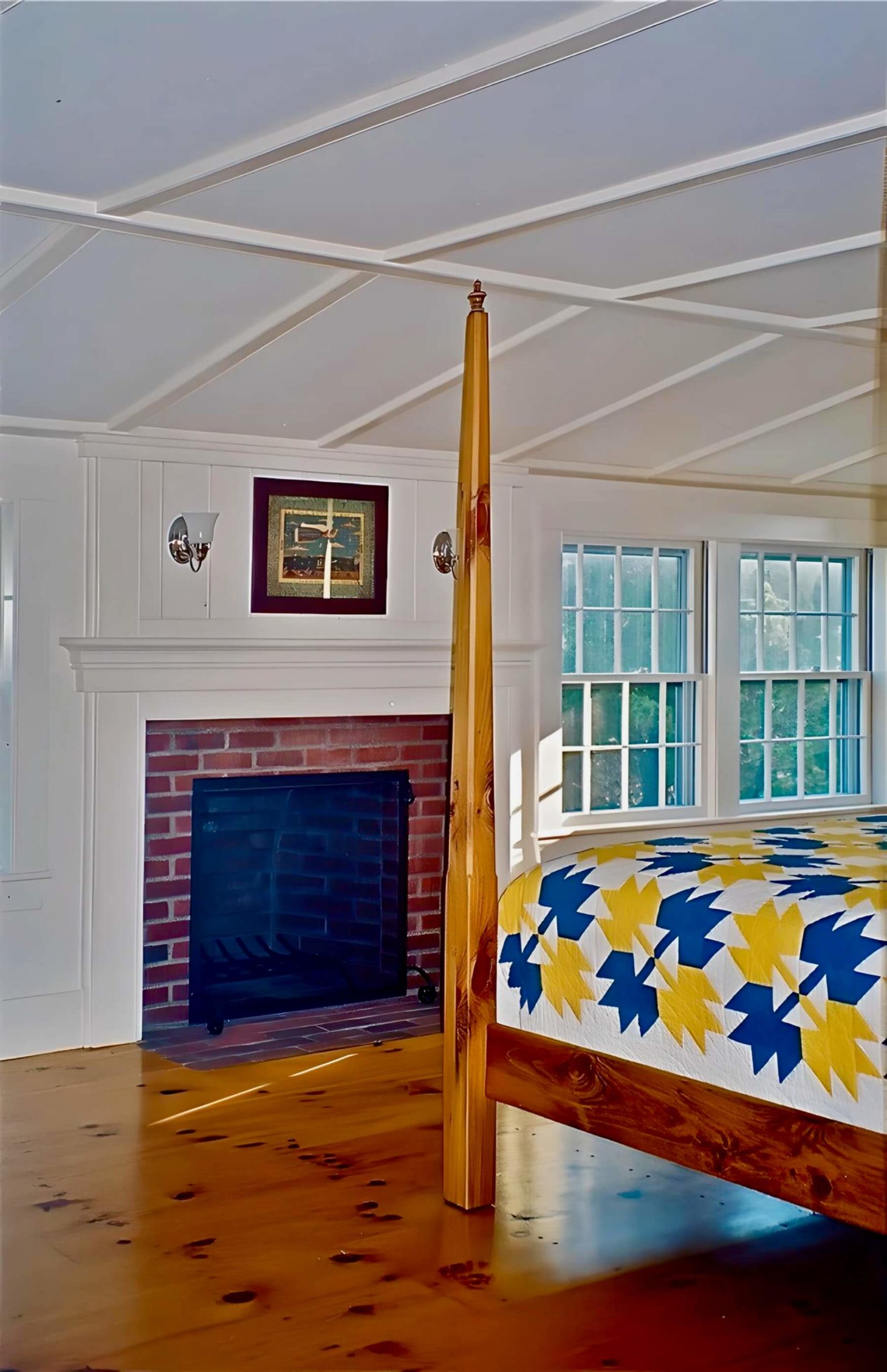 Upstairs are three more bedrooms including a second master suite with its own fireplace. The extensive millwork, trim, interior doors, paneling, ceiling treatments, stairs, railings and cabinets were all built on site. The construction of the kitchen was the subject of an article in Fine Homebuilding magazine.