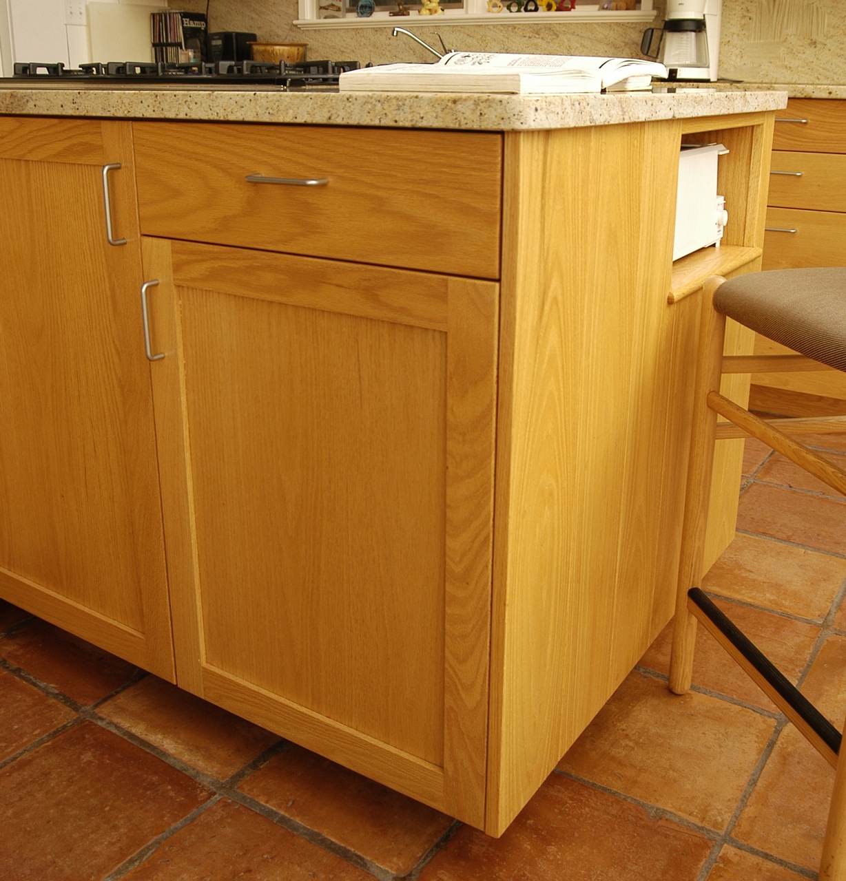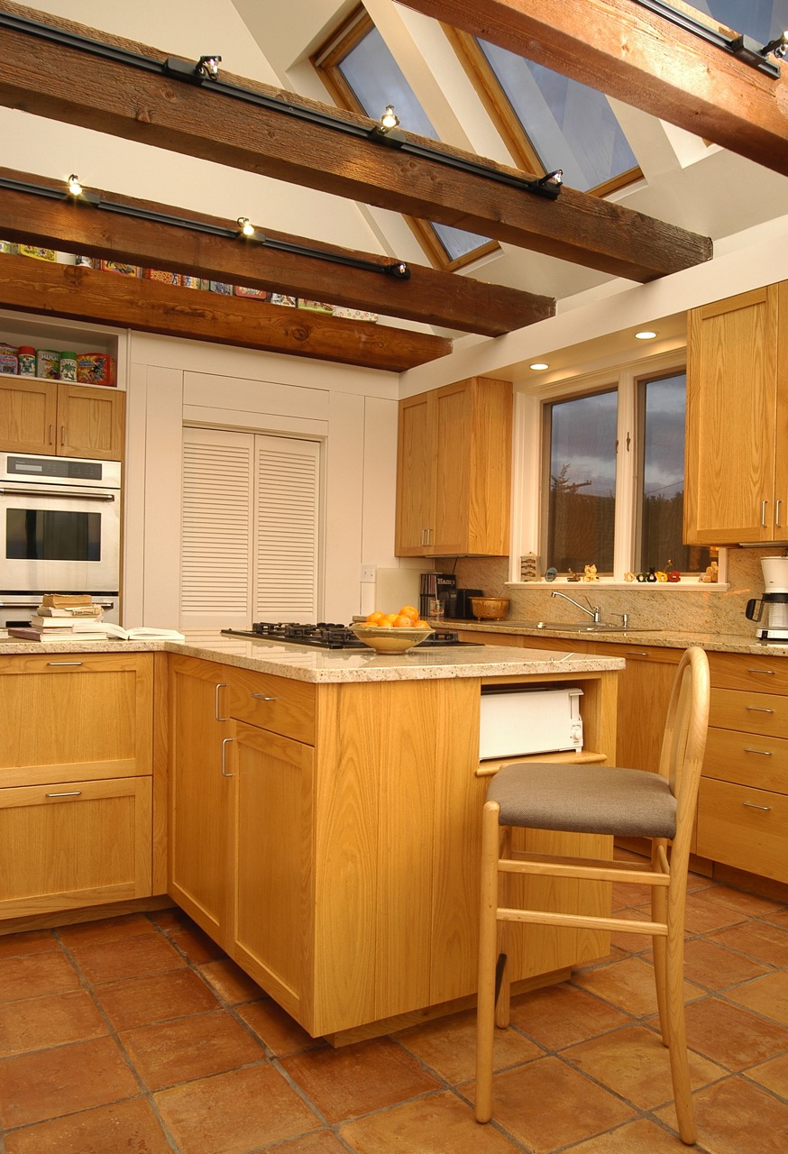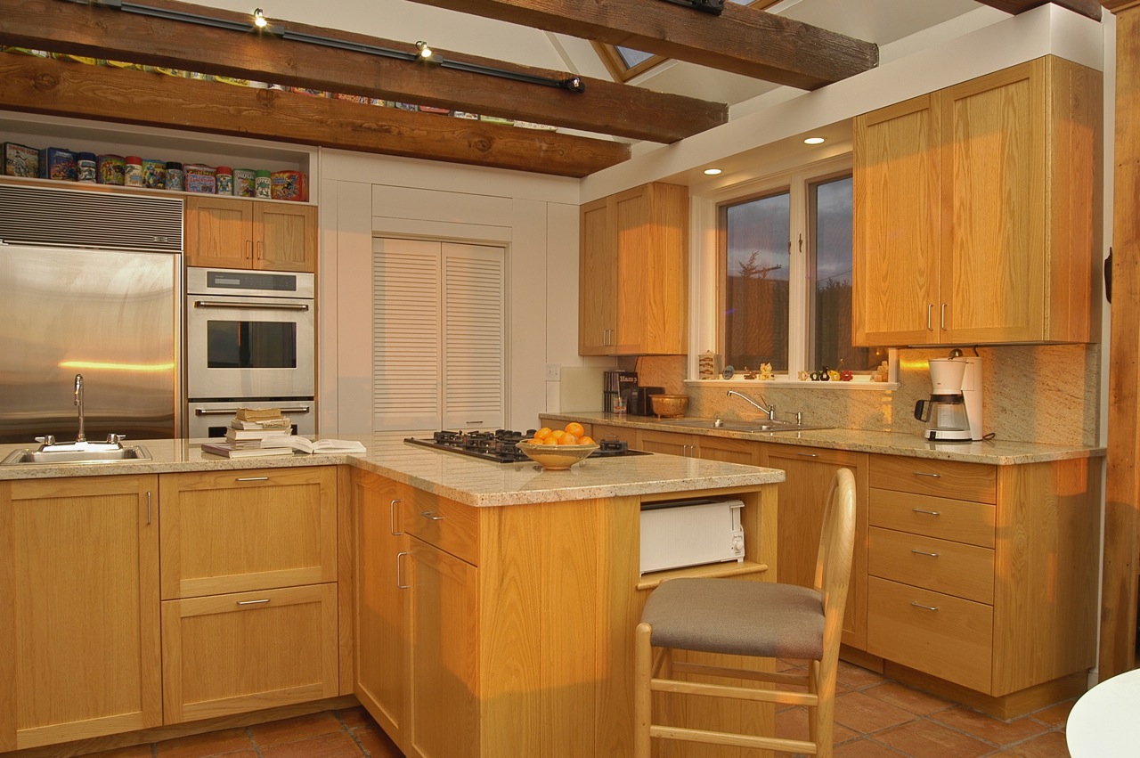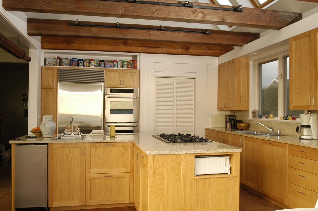 The kitchen of this spectacularly sited and beautifully designed house overlooking Stage Harbor had not been updated since the house was built in the 1970s. Without changing the character of this beloved room, we brought it into the current century with new oak cabinets with many specialized drawers, stone counters, new lighting and appliances.