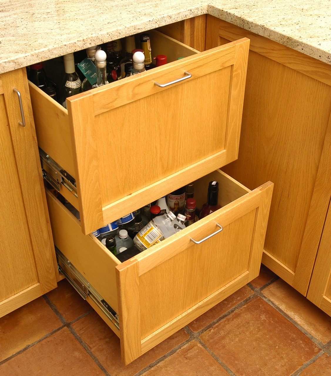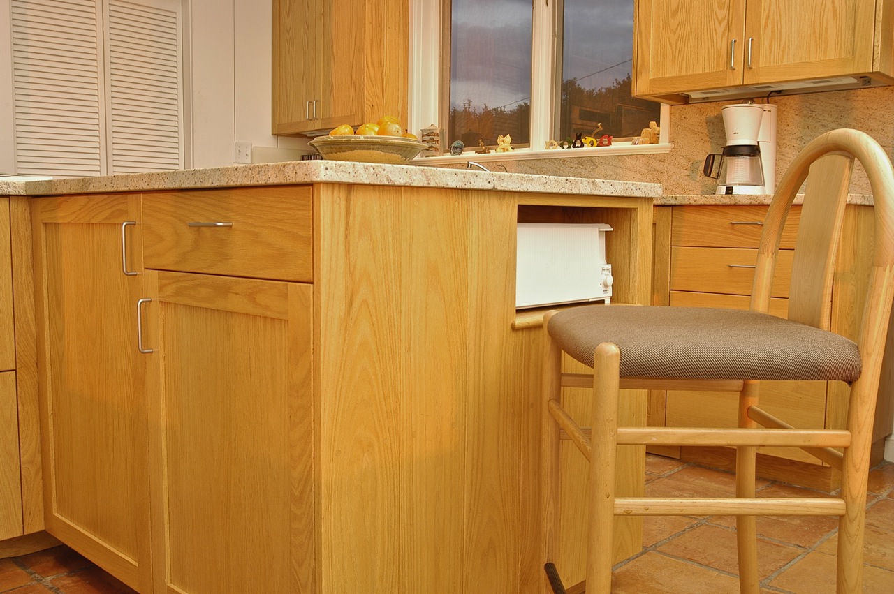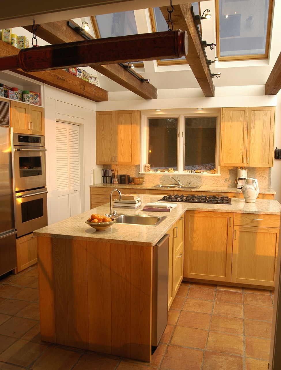 The kitchen of this spectacularly sited and beautifully designed house overlooking Stage Harbor had not been updated since the house was built in the 1970s. Without changing the character of this beloved room, we brought it into the current century with new oak cabinets with many specialized drawers, stone counters, new lighting and appliances.