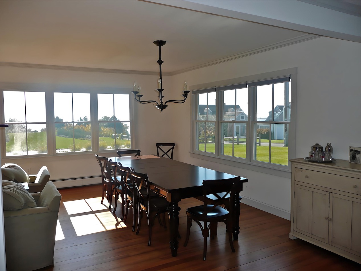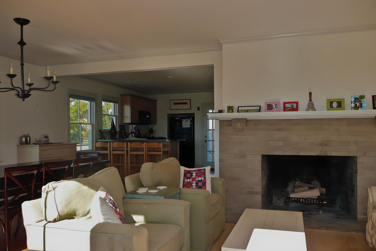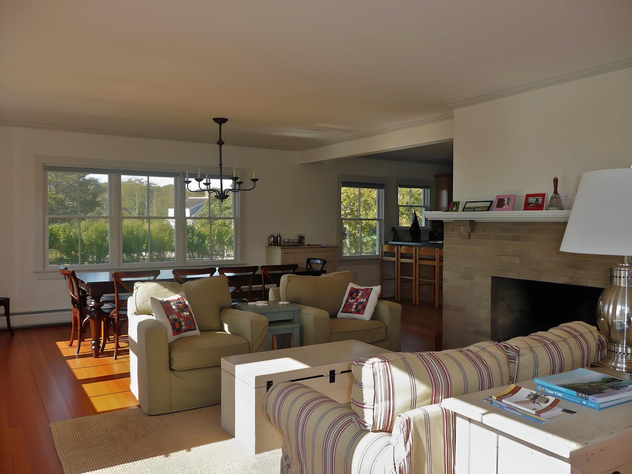 This house on a hill overlooking Stage Harbor had an unlikely origin as a pre-cut kit made in Ohio and shipped to Chatham, where it was assembled in the late 1930s.  The interior walls and ceiling were finished with a relatively new material called plywood. Combined with very small windows, this made for a very dark interior.  We brightened the house considerably by adding large windows to capture the water views, removing a wall between the kitchen and dining area, and by covering the walls and ceilings with drywall. Painted white, the living space is now filled with light, and the harbor is now a presence in the room.