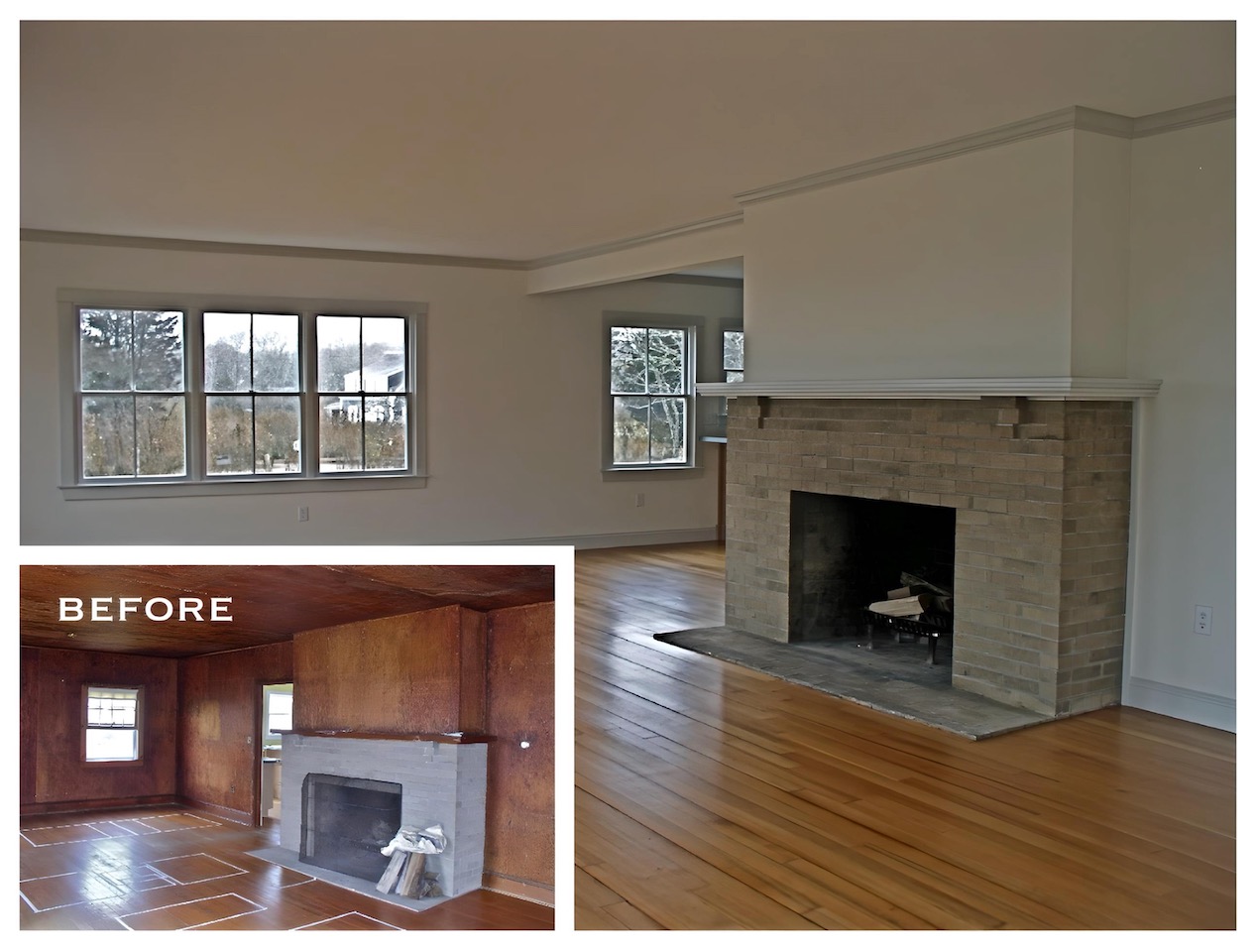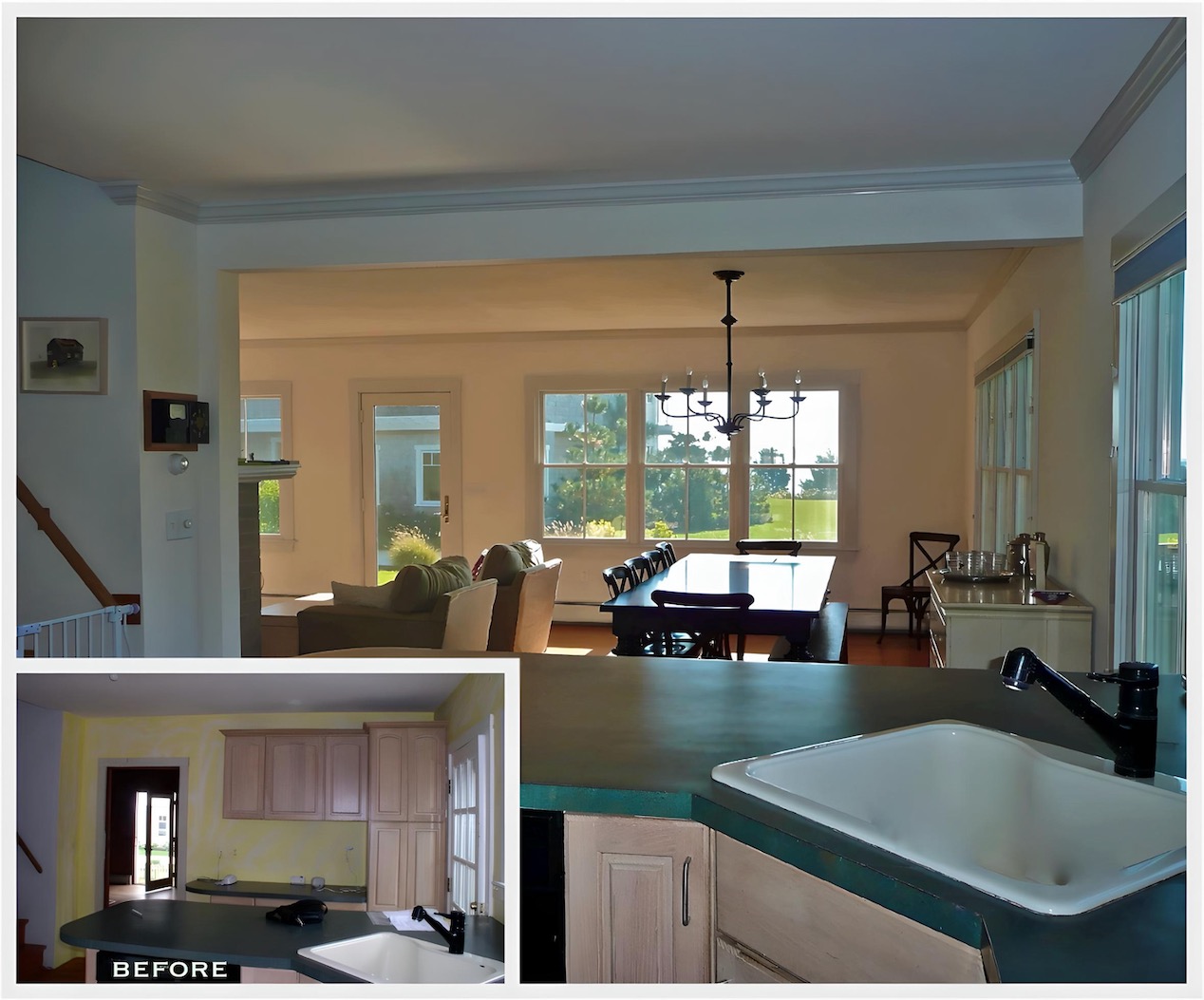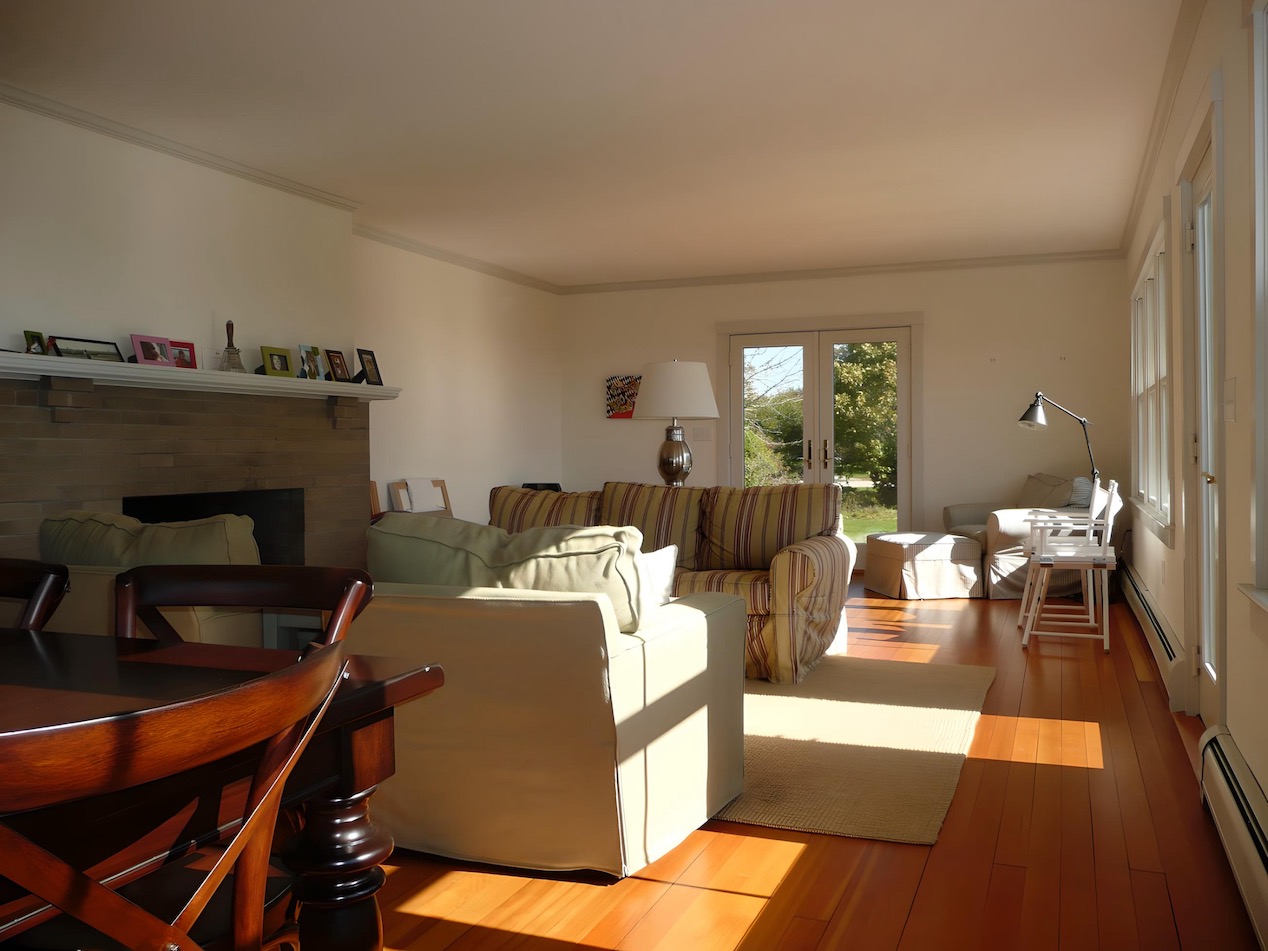 This house on a hill overlooking Stage Harbor had an unlikely origin as a pre-cut kit made in Ohio and shipped to Chatham, where it was assembled in the late 1930s.  The interior walls and ceiling were finished with a relatively new material called plywood. Combined with very small windows, this made for a very dark interior.  We brightened the house considerably by adding large windows to capture the water views, removing a wall between the kitchen and dining area, and by covering the walls and ceilings with drywall. Painted white, the living space is now filled with light, and the harbor is now a presence in the room.